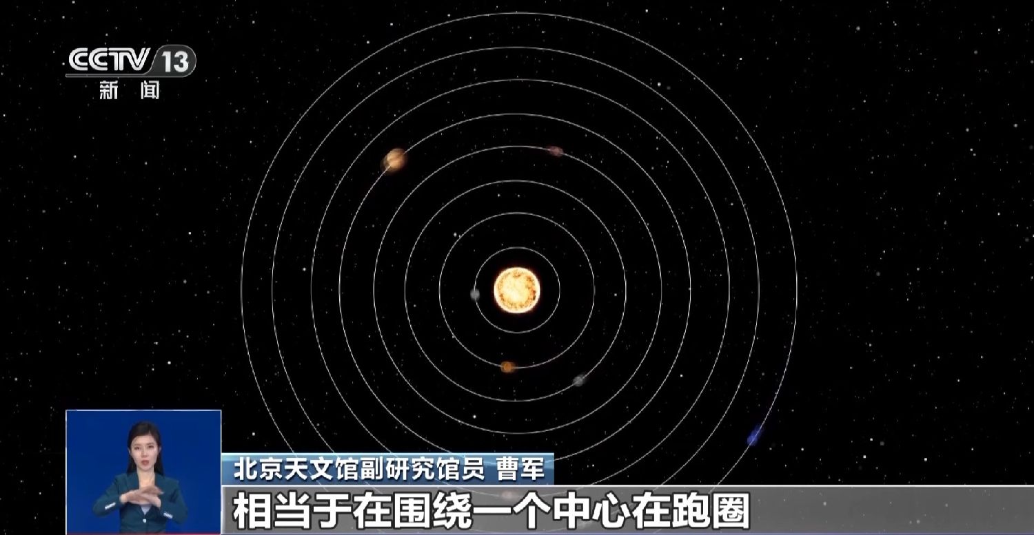北京天文馆副研究员曹军:地球以外的这些行星,在运动的时候,有可能从地球上看,它跟太阳基本上成一条直线,这个现象在天文上叫作合。火星是我们地球之外的那颗大行星,它也是绕着太阳有一个公转的运动,它们公转的轨道基本上是在一个平面上。相当于围绕一个中心在跑圈,地球在内侧、火星在外侧,地球跑得快,它跑得慢,那就有可能地球跑到了太阳的另一侧。