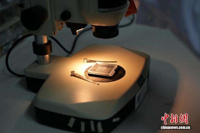 本项研究在实验室拍摄的显微镜下观察小尺寸芯片。中国科学院物理研究所供图