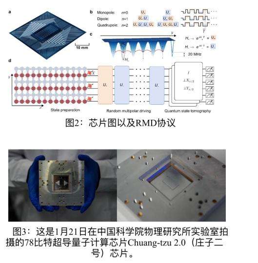 本项研究的芯片图及RMD协议(上图),以及在实验室拍摄的78比特超导量子计算芯片“庄子2.0”。中国科学院物理研究所供图