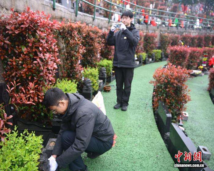 近日,在湖南长沙唐人万寿园公墓,身着工装的礼仪师黄杰和何宇翔正在开展代客祭扫。记者唐小晴摄