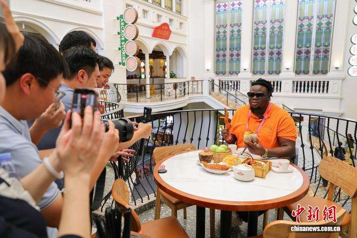 “我在海口吃老爸茶,老爸茶吼加(海南话,意为‘好吃’)!”尼日利亚籍主播博密(OLUWABUNMI HENRY JIMOH)在海口骑楼老街的椰城喜鹿老爸茶店里,手拿椰奶冻和炸鸡翅,用海南话向镜头热情表达对海南老爸茶的喜爱。
