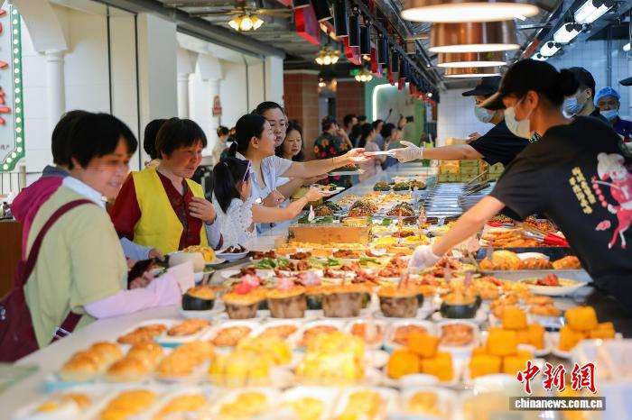 4月13日,海口骑楼老街的椰城喜鹿老爸茶店里,花样繁多的老爸茶小吃吸引顾客选购。中新网记者骆云飞摄