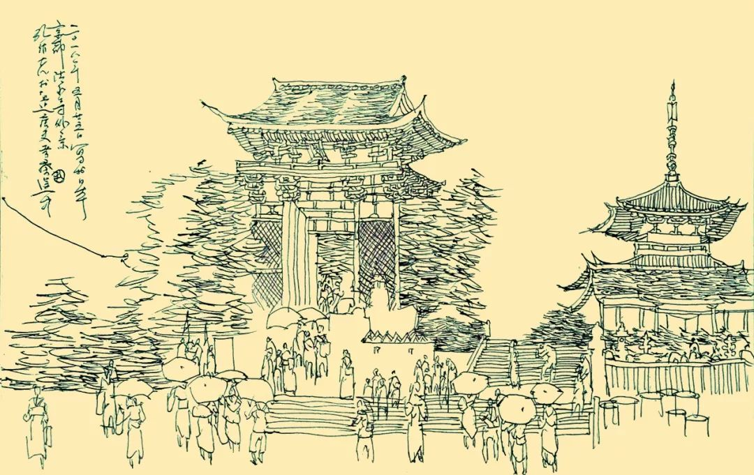 图为孔维克写生作品。观音千手——京都清水寺外景(圆珠笔2018年)。(图/山东画院微信公众号)