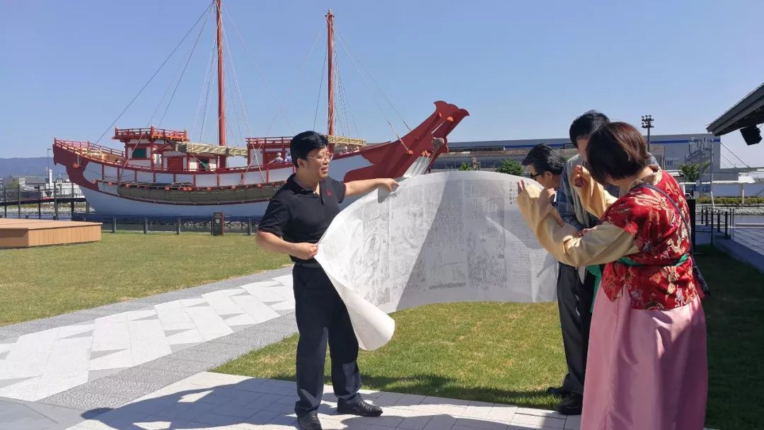 图为孔维克在平城宫遗址公园,观看《遣唐使阿倍仲麻吕》影像片,并在摹拟遣唐使船前解读创作构思。(图/山东画院微信公众号)